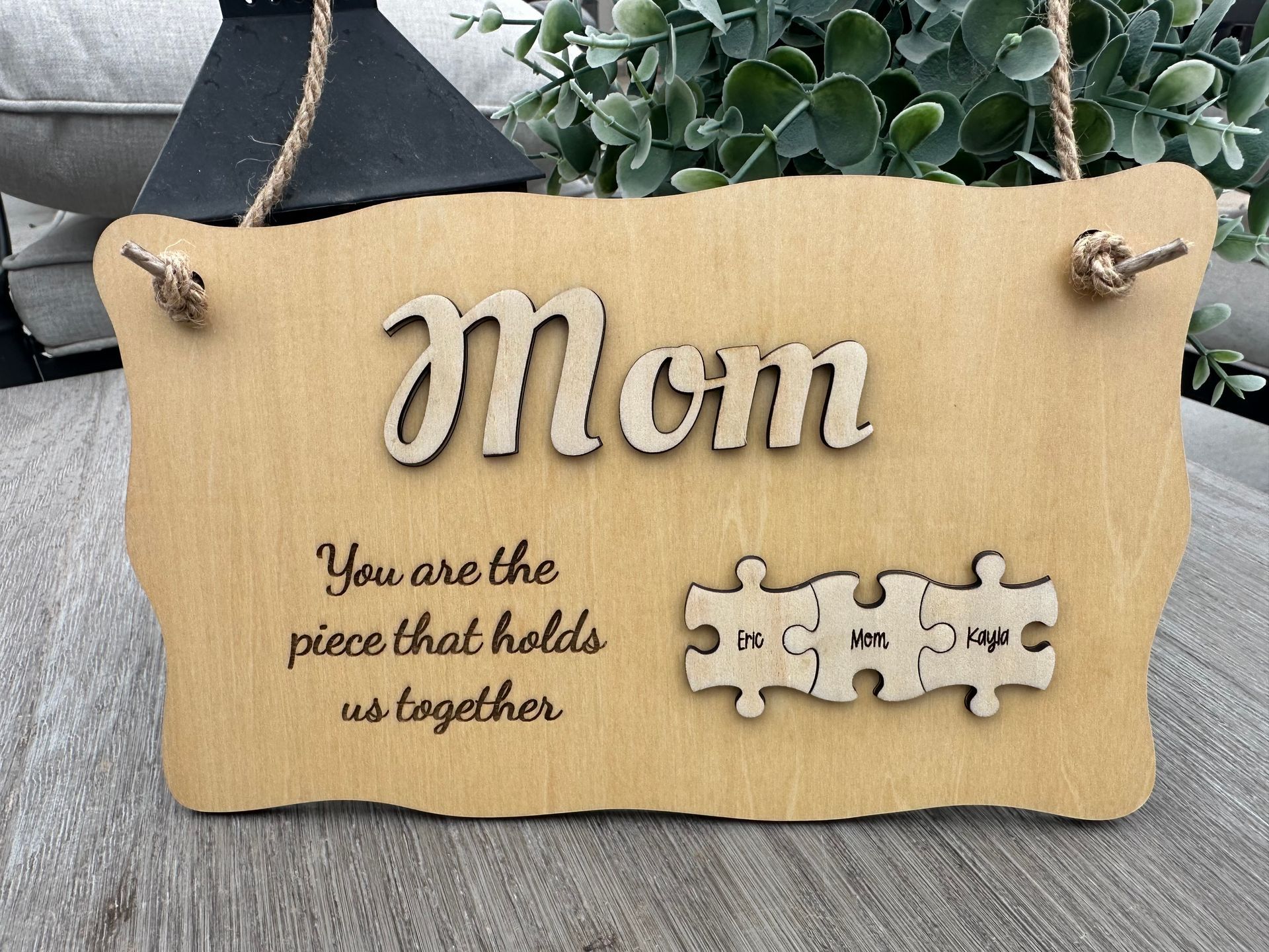 Crafted from high-quality wood with a charming wavy border and rustic twine hanger, this sign features a 3D-layered "Mom" title and interlocking puzzle pieces engraved with the names of her loved ones.
